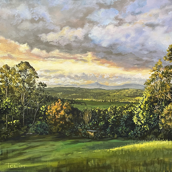 This is a reworking of an earlier painting at a larger size and from a slightly different angle, painted as a commission piece. I pushed the drama of the light further in this version to really accentuate the golden hour atmosphere. This is the view from our property. Lucky us!