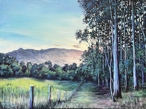 This painting depicts the boundary of a property on the Mid North Coast that used to be my home. I loved the cool shadows of the forest’s edge contrasted with the day’s last burst of light flooding in from behind.