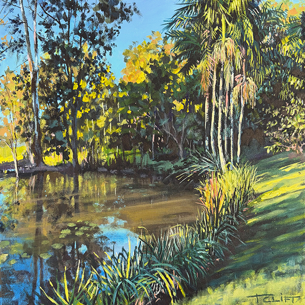 This little painting captures the late afternoon light on the dam in my background - such a serene place.