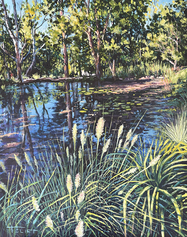 Another little painting of the pretty dam in my backyard featuring the grasses we planted along the shoreline capturing the sunlight.
